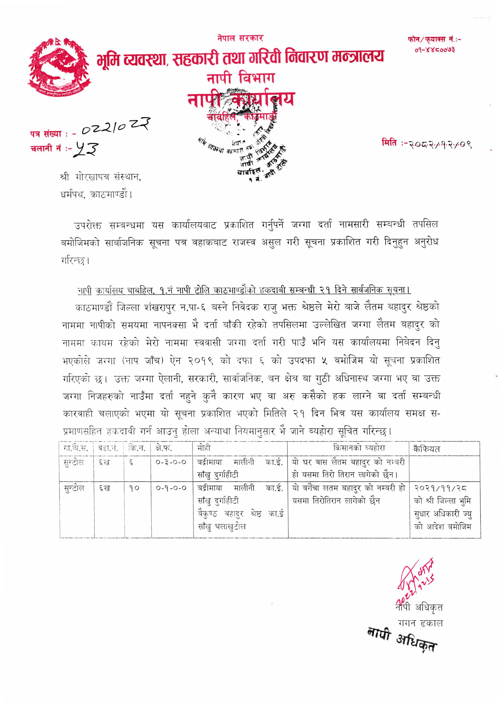 » नापी कार्यालय चाबहिल, १ नं. नापी टोली काठमाडौंको हकदाबी सम्बन्धी २१ दिने सार्वजनिक सूचना।