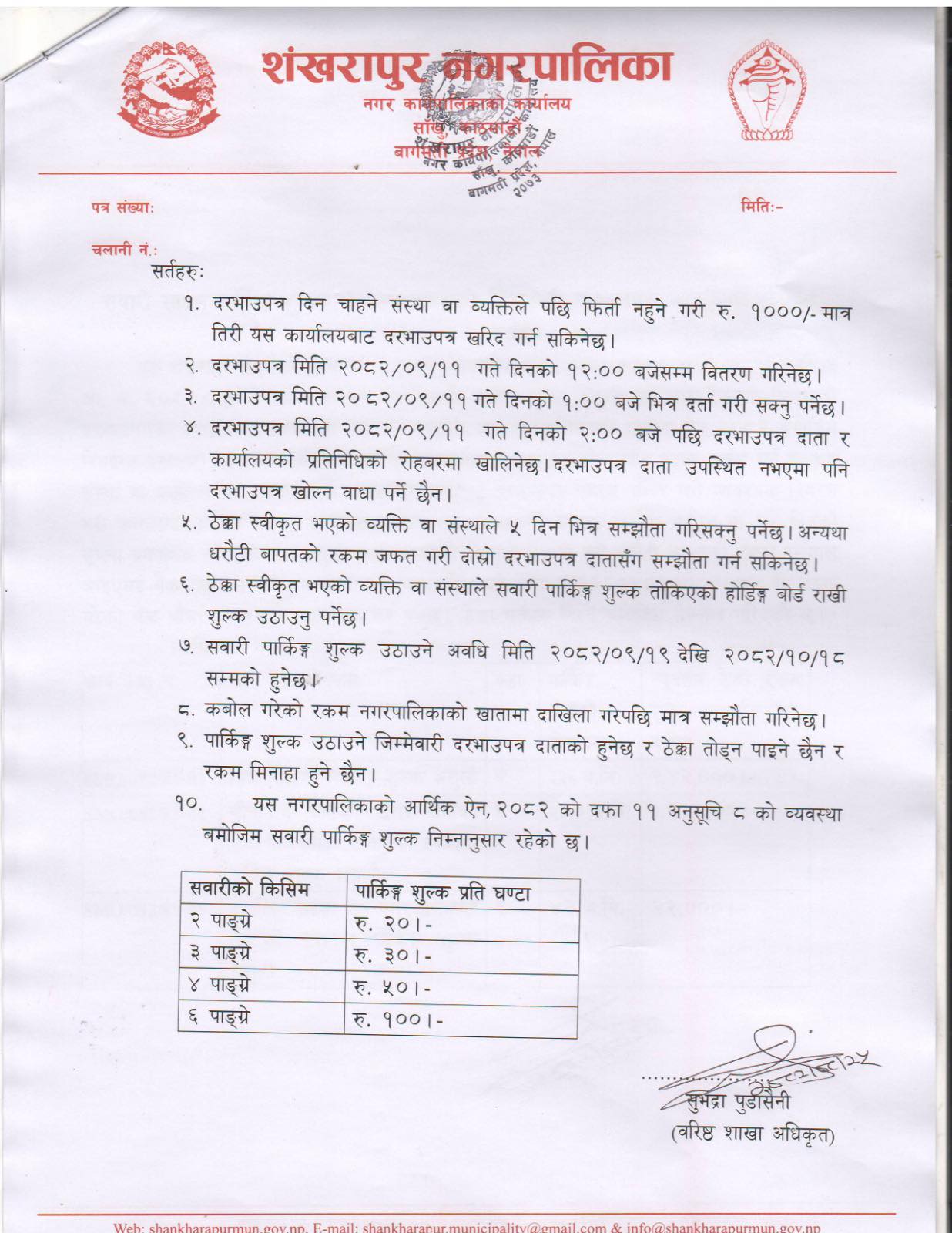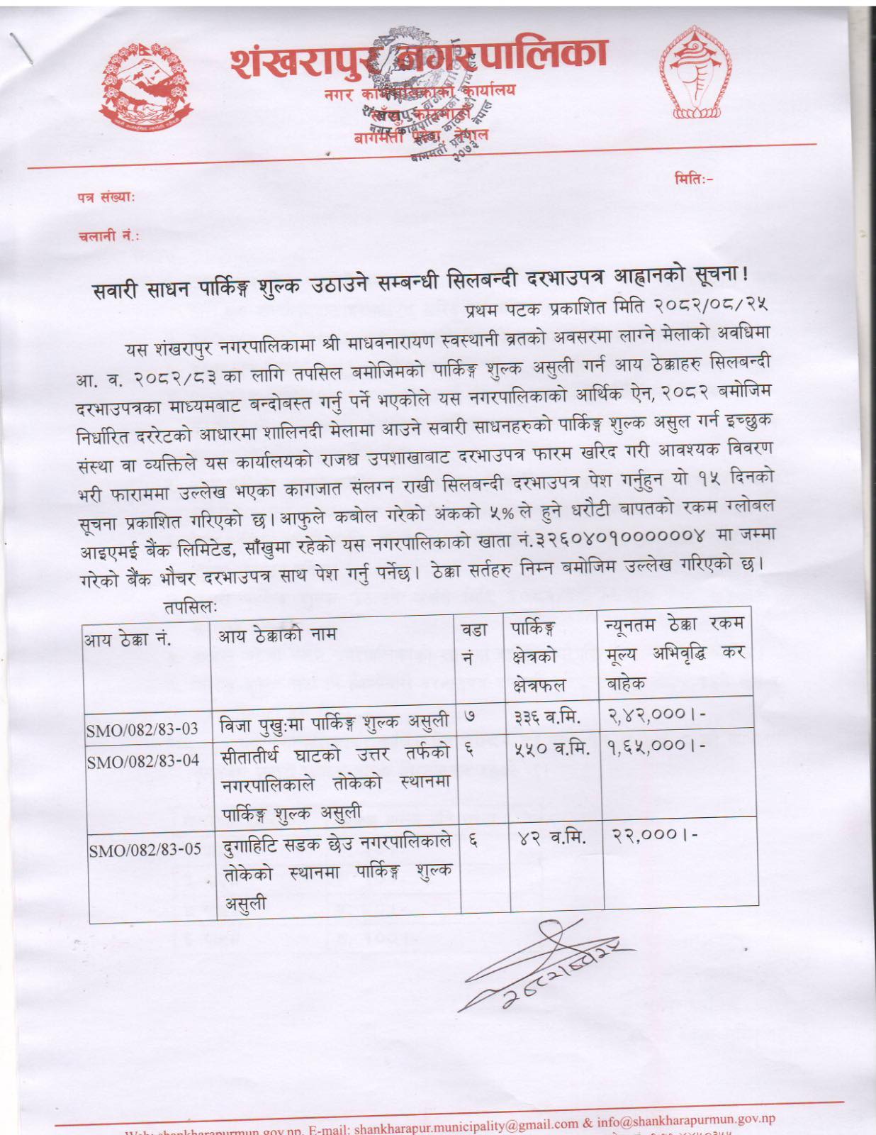 सवारी साधन पार्किङ्ग शुल्क उठाउने सम्बन्धी सिलबन्दी दरभाउपत्र आह्वाको सूचना