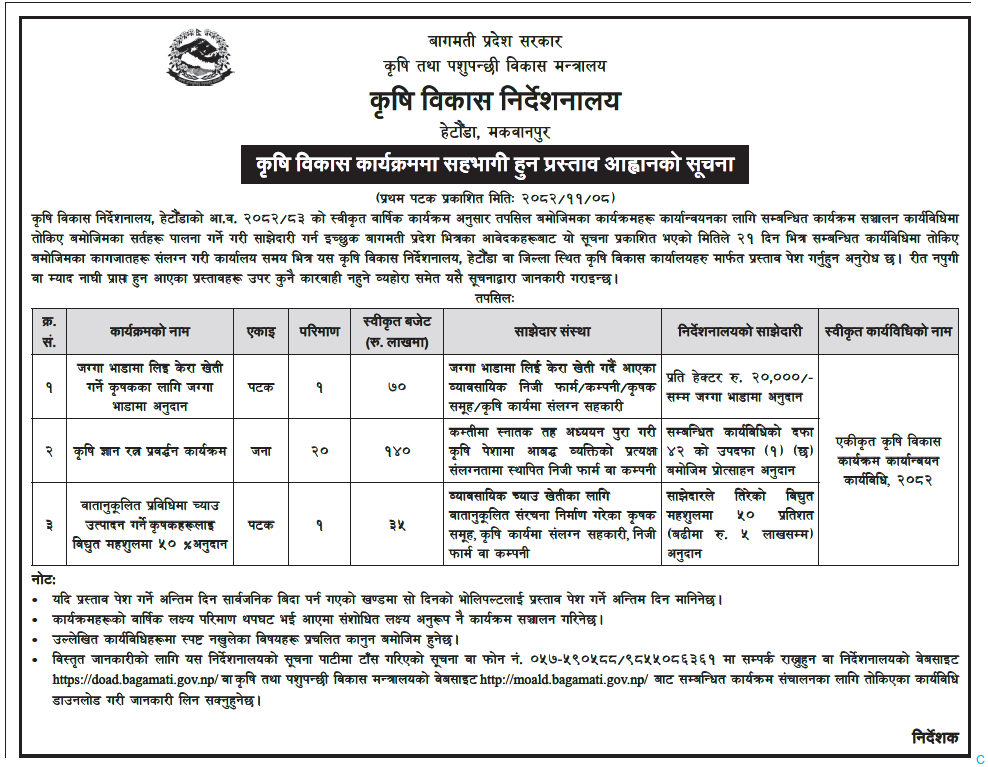कृषि विकास कार्यक्रममा सहभागी हुन प्रस्ताव आह्वानको सूचना